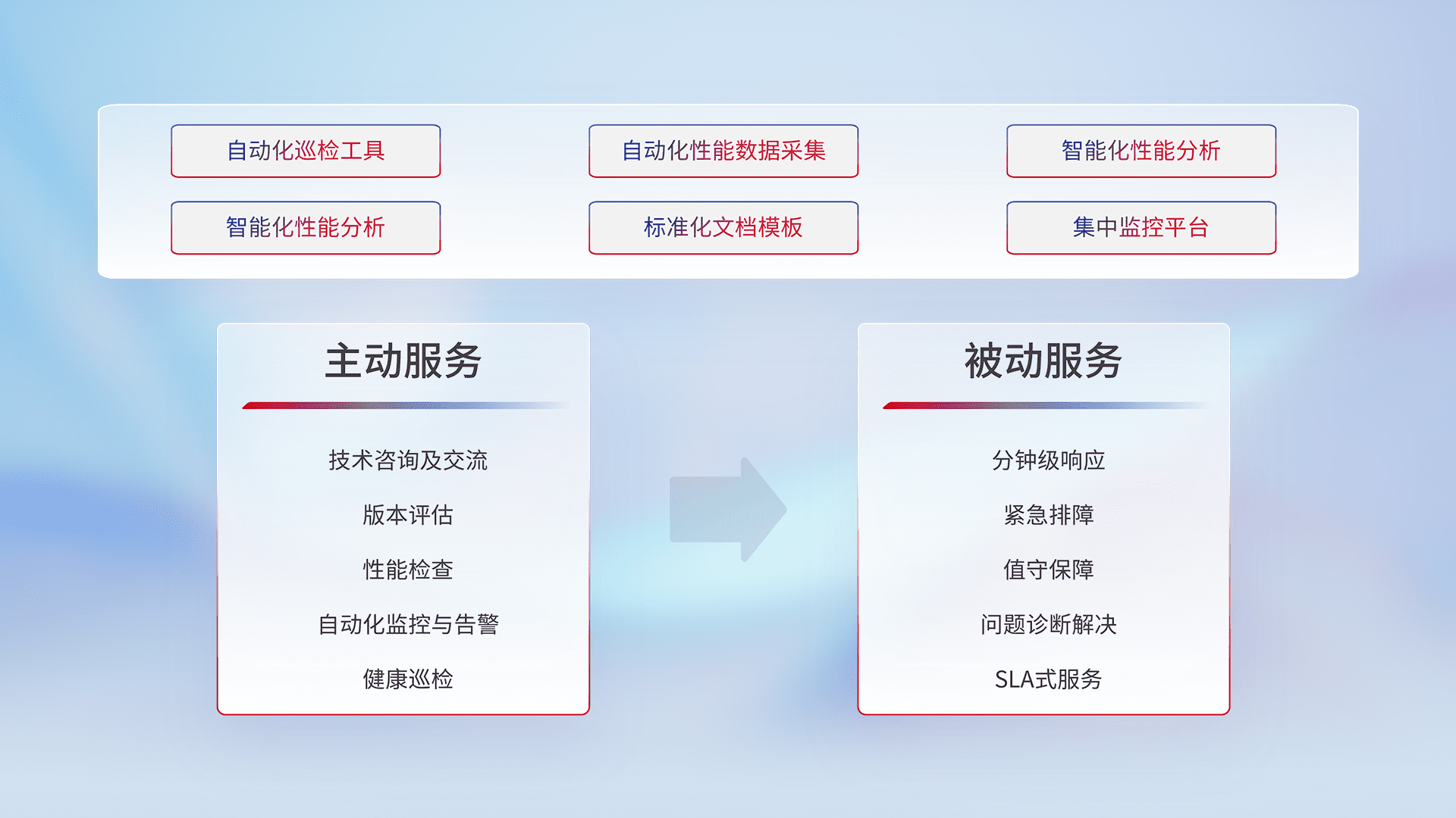 智能化工具和标准化文档,,保障服务质量,,提供主动服务(包含技术咨询、、版本评估、、性能检查、、自动化监控与告警、、、、健康巡检)和被动服务包含(分钟级响应、、、紧急排障、、值守保障、、、、问题诊断解决、、、SLA服务)。。。。